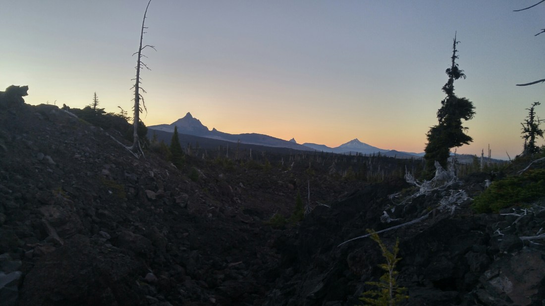 We met Legend and another trail angel, Coppertone, just after crossing highway 242, North of the Three Sisters. We had had a late start to the day, so we hiked 2 miles across lava fields in the gathering darkness, my headlamp and high-top boots sparing my ankles some nasty turns.
